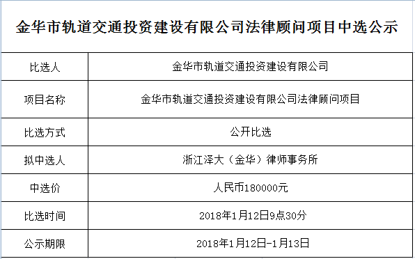 金華市金義東軌道交通有限公司運營2026-2027年度活動實施服務(wù)機(jī)構(gòu)框架協(xié)議項目中標(biāo)候選人公示