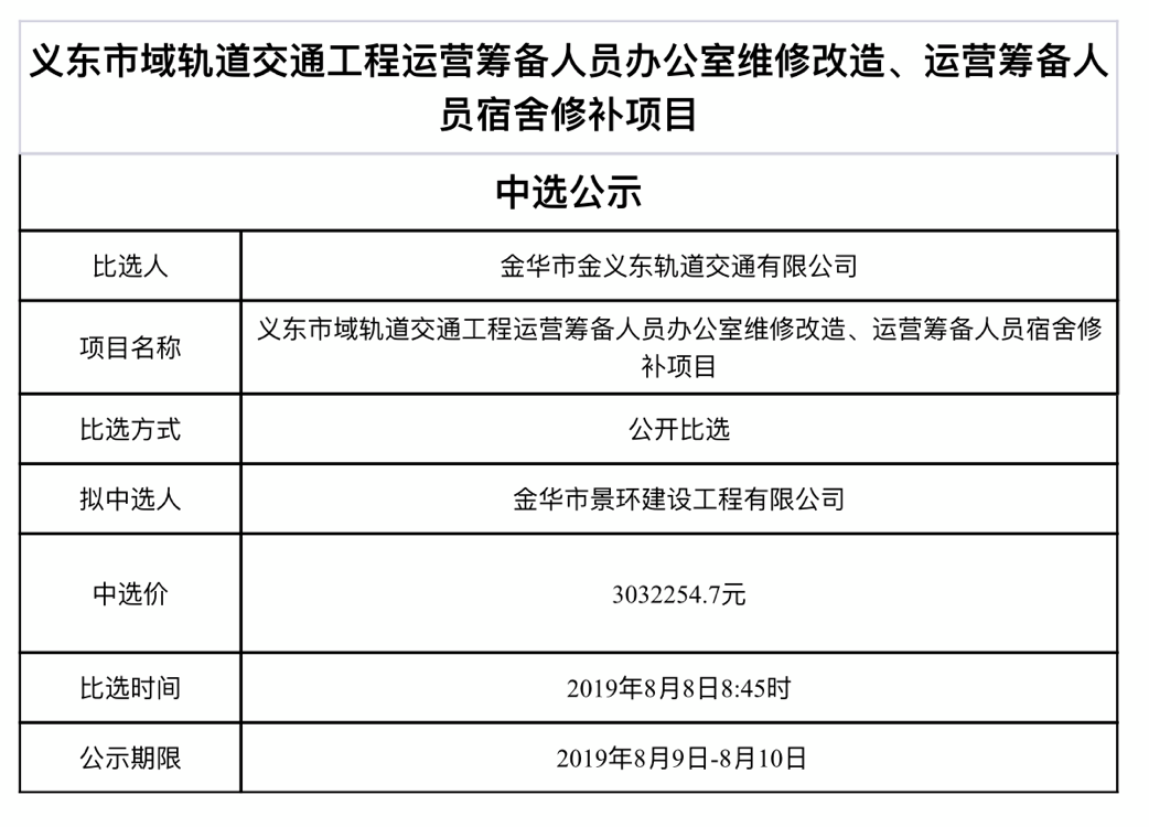 金華市金義東軌道交通有限公司運營2026-2027年度活動實施服務(wù)機構(gòu)框架協(xié)議項目中標(biāo)候選人公示